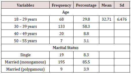 Table 1: Showing demographic variables (age, marital status and education) of respondents.